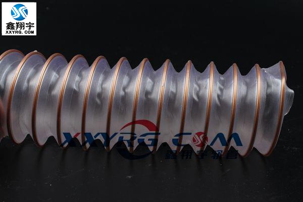 產品特點:半透明PU管壁, 帶鍍銅色包塑鋼絲螺旋加強 -40°C / + 90°C (短時間可耐受125°C) 聚酯型聚氨酯(ESTER PU)軟管, 帶鍍銅色包塑鋼絲螺旋加強筋。內壁平滑, 以保證物料在管內流動順暢. 和傳統的橡膠軟管和PVC軟管相比具有極高的耐磨度和使用壽命。不同規格產品的壁厚相同, 均為0.9毫米。耐礦物油、耐化學品。具有優異的耐臭氧和耐候性,低溫下仍能保持很好的柔軟度。不含鹵素,符合RoHS環保指令要求,原材料符合 REACH的規定。螺旋鋼絲接地可以排靜電, 符合TRB S 2153的排靜電標準。 用于顆粒、磨損性粉末、刨花或鋸末的抽吸和傳輸。適合塑料行業、陶瓷行業的物料傳輸或除塵等。在掃地車、路面清潔車、除草機等設備上也得到廣泛的應用。